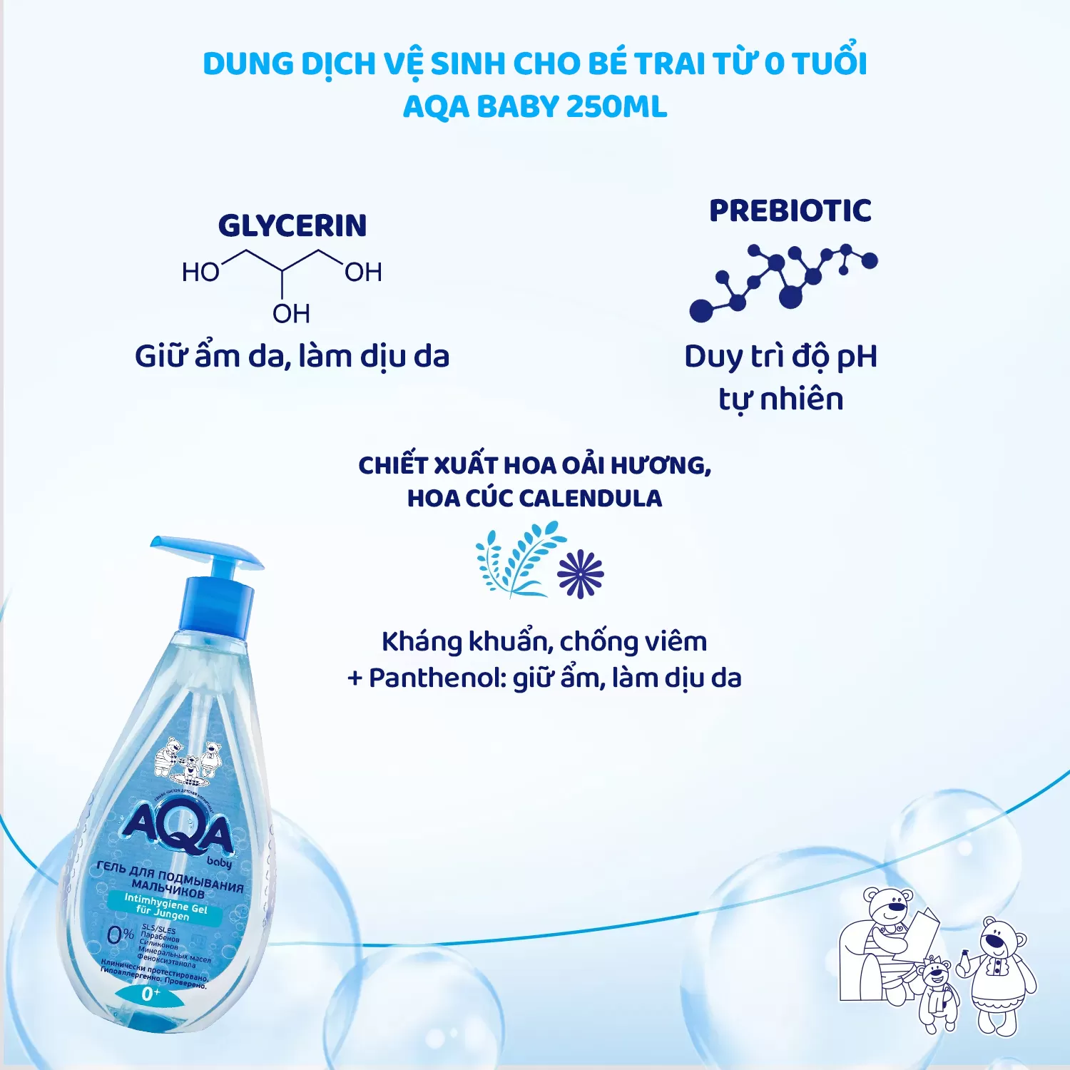 Dung dịch vệ sinh bé trai AQA baby được nghiên cứu và phát triển với sự hợp tác của các bác sĩ phụ khoa dành riêng cho trẻ em để làm sạch và chăm sóc làn da mỏng manh nhất của vùng kín cho bé từ những ngày đầu tiên của cuộc đời.