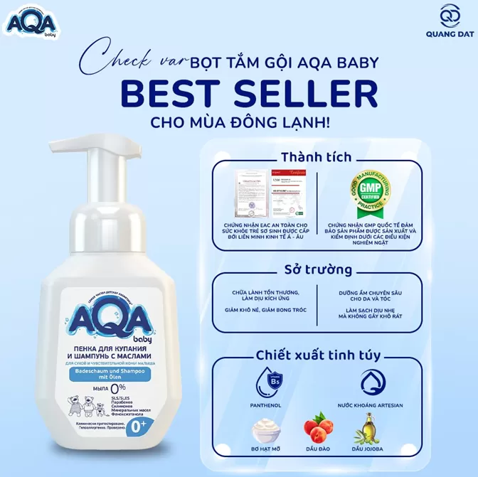 - Khả năng chữa lành và phục hồi da: Nhờ vào tác dụng của Panthenol, Bọt tắm gội Aqa Baby giúp làm dịu và chữa lành các tổn thương da, bảo vệ da bé khỏi các vấn đề về kích ứng hoặc viêm nhiễm.