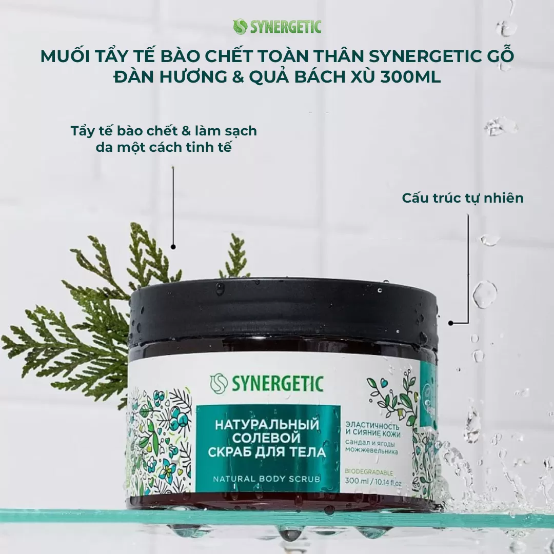MUỐI TẨY TẾ BÀO CHẾT TOÀN THÂN SYNERGETIC GỖ ĐÀN HƯƠNG & QUẢ BÁCH XÙ là liệu pháp kết hợp gỗ đàn hương, quả bách xù, hạnh nhân, dầu dừa, bơ hạt mỡ, và mơ tây giúp da được làm sạch sâu, mềm mại, nhưng vẫn giữ được độ săn chắc, đàn hồi đồng thời lưu lại hương thơm ngát ngọt ấm, đầy mạnh mẽ trên toàn bộ cơ thể.